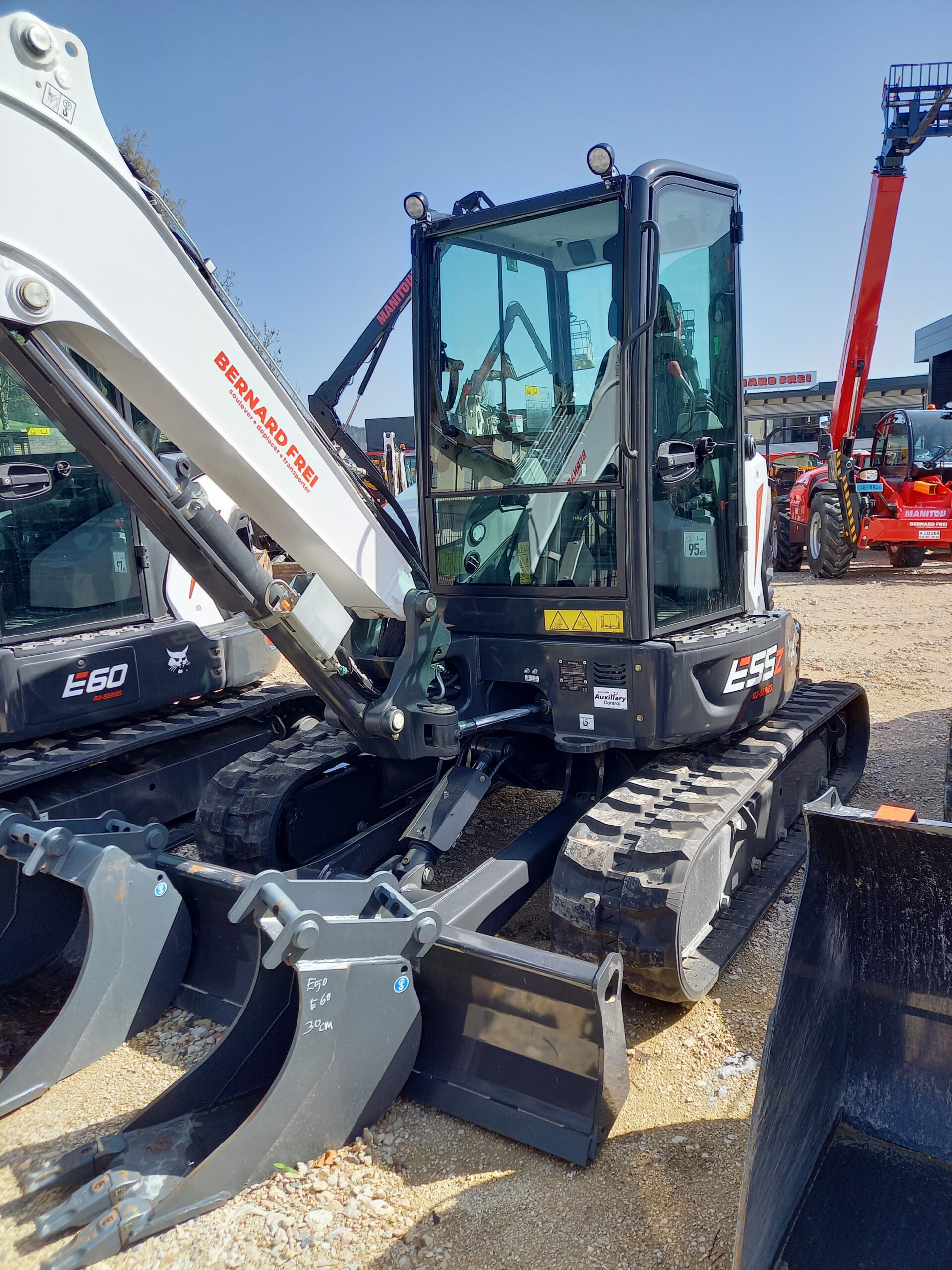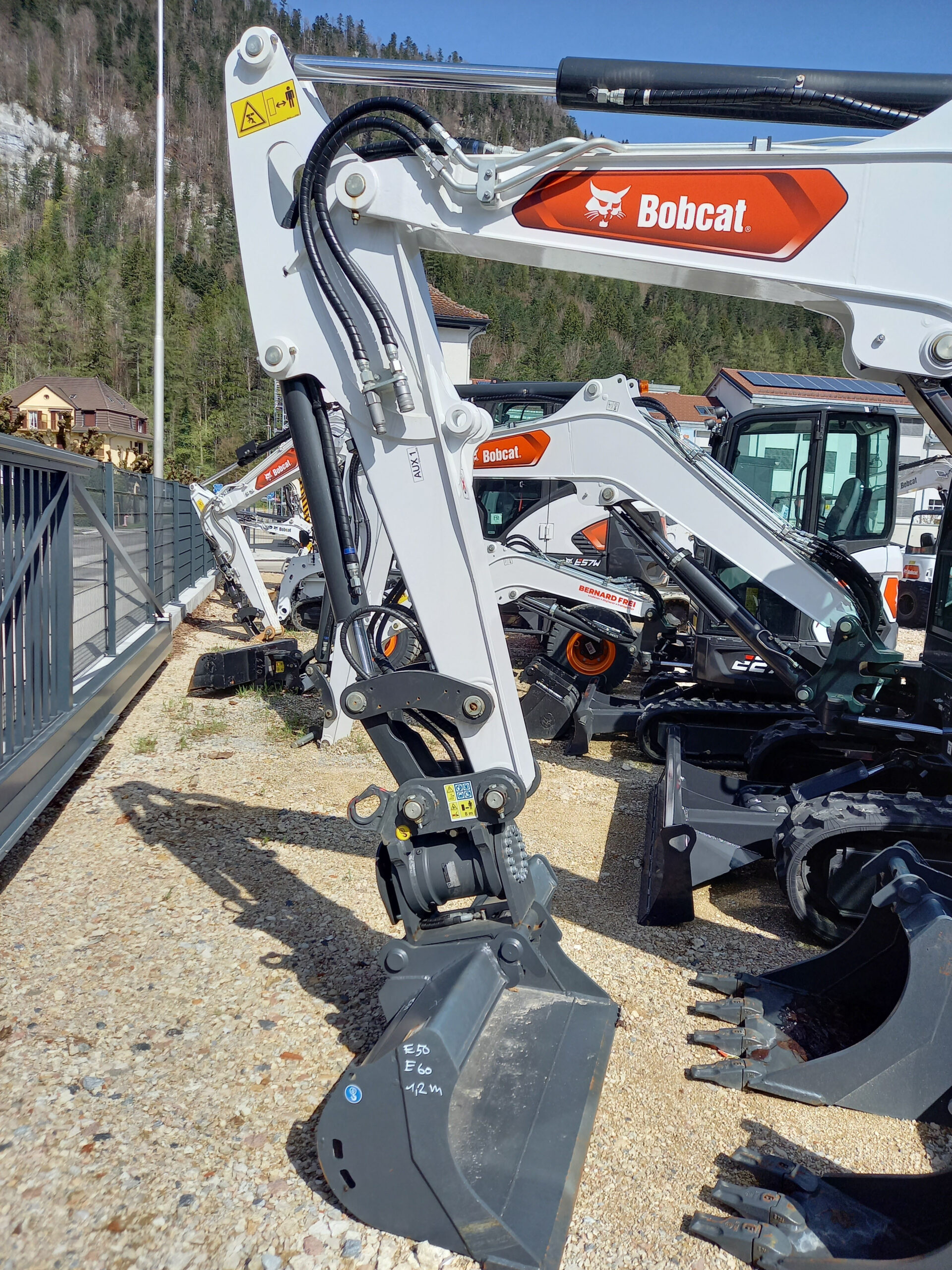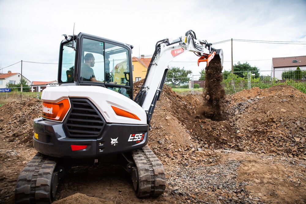 Moteur Bobcat 1.8 l, Stage V, 3 cylindres, 36.4 kW, 50 CV – Vitesse 4.6 km/h – Poids en ordre de marche 5346 kg – Largeur 1959 mm – Cabine climatisée avec radio bluetooth – Circuit accessoire 1 et 2 sur balancier et coupleurs – Siège tissu – Retour direct pour marteau – Tension auto chenilles – Circuit hydraulique Powertilt – OHD – Feux LED sur cabine – Drainage – Attache MS03 et crochet