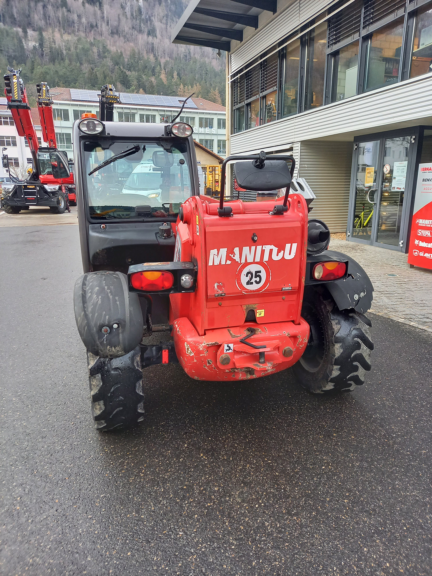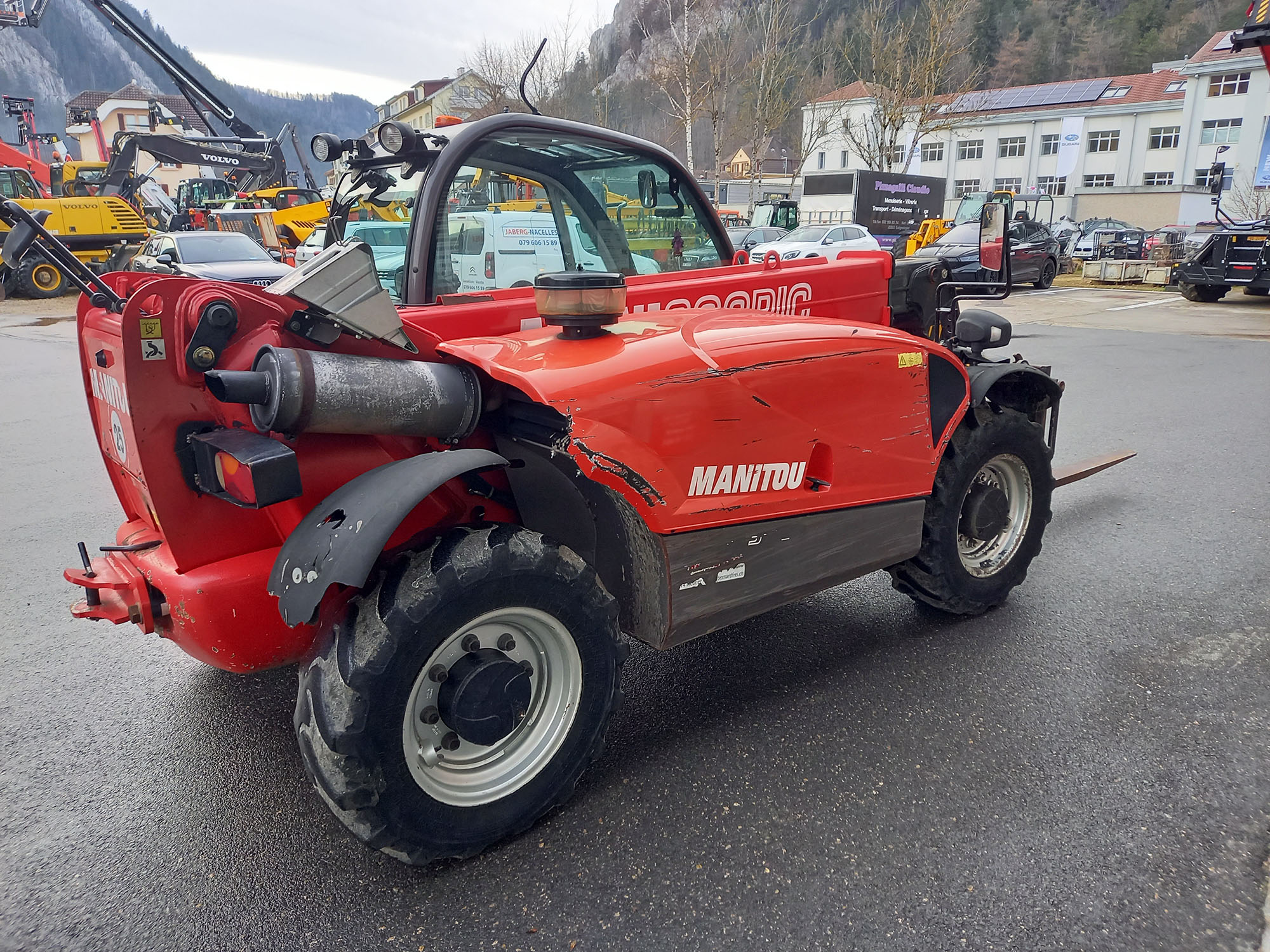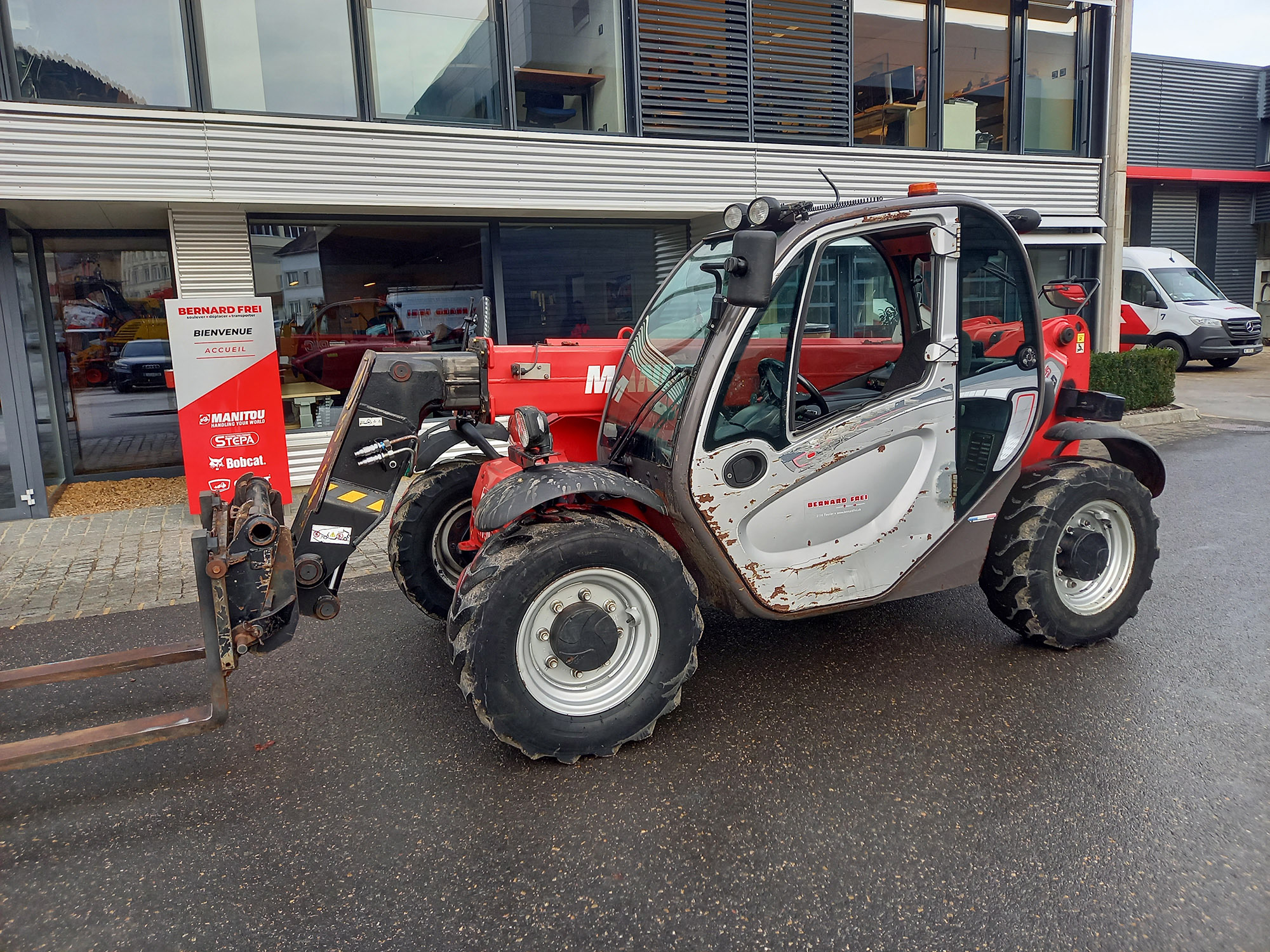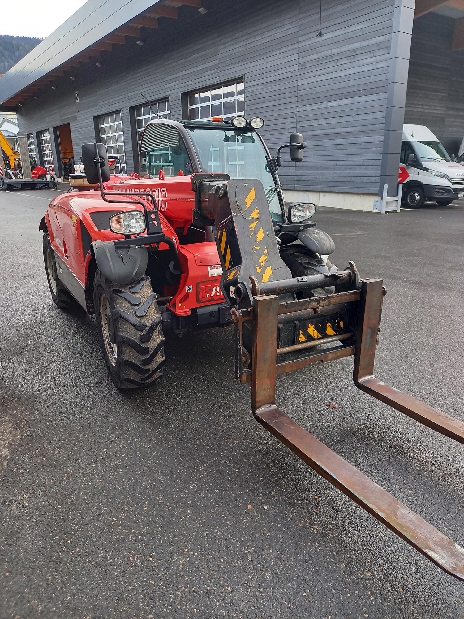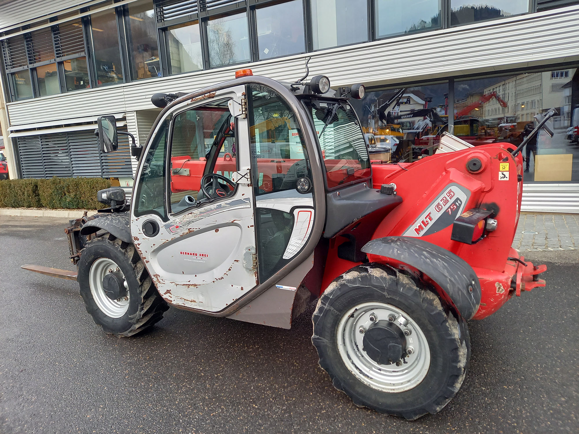 Capacité de levage 2500 kg – Hauteur de levage 5.90 m – Moteur Diesel Kubota, Puissance 55.4 kW, 75 CV – Transmission hydrostatique 2 vitesses – 4 roues motrices, 2 ou 4 roues directrices, marche en crabe – Cabine complète avec chauffage – Monolevier Joystick JSM – Essuie glace & lave glace avant + essuie glace arrière – Sélecteur de vitesse route / chantier – Indicateur d’état de charge – Témoin d’alignement des 4 roues – Éclairage de route complet – Prise 7 pôles arrière – Colonne de direction réglable – Essuie glace sur hublot de toit – Circuit hydraulique en tête de flèche et coupleurs – 4 phares de travail sur la cabine : 2 Av et 2 Ar – Prise 12 volts 3 pôles sur bras de base – Crochet arrière saillant