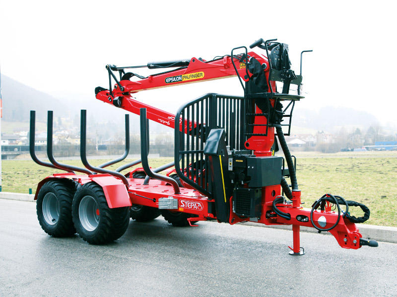 Les grues forestières Stepa sont conçues spécialement pour être utilisées sur des remorques forestières. L’appui est déjà intégré à la remorque forestière et on obtient ainsi un centre de gravité bas de l’ensemble de la remorque. Les grues se distinguent par leur géométrie optimale grâce à laquelle on obtient une plus grande maniabilité, une force de levage plus élevée, surtout au-dessus des ranchers, et une longueur de dépose courte. Chaque grue est équipée, en série, d’un solide rotator de 4,5 to et du cardan breveté EPSLINK d’Epsilon. Sur toutes les grues à système télescopique double, les flexibles sont montés dans le système de bras et, ainsi, protégés au mieux contre les avaries. Une remorque forestière ne vaut, en effet, la peine, qu’avec une bonne grue.